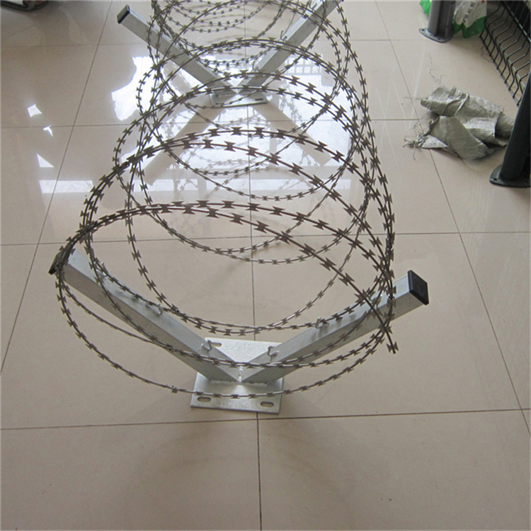 1 、安装滚刀网在围墙上,要有配备的支架来支撑刀片刺网易安装,这样安装出来的效果美观。首先是在围墙上打眼用螺丝稳固刀片刺网立柱 ,一般情况是每隔3米一个支撑柱子。