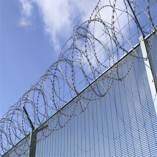 监狱隔离网加装刀刺网的作用:监狱隔离网加装刀刺网是用V型支架立柱,加强型焊接片网,安全防盜连接件和热镀锌刀片刺笼组成,强度和安全防御性级别很高。近年来,被广泛应用在监狱,军事基地等高安全场所。在监狱隔离网顶部加装刀刺网, 是一种发展起来的防护、隔离能力较强的新型隔离网产品,提高了监狱看守所等高防护场地的防御能力。