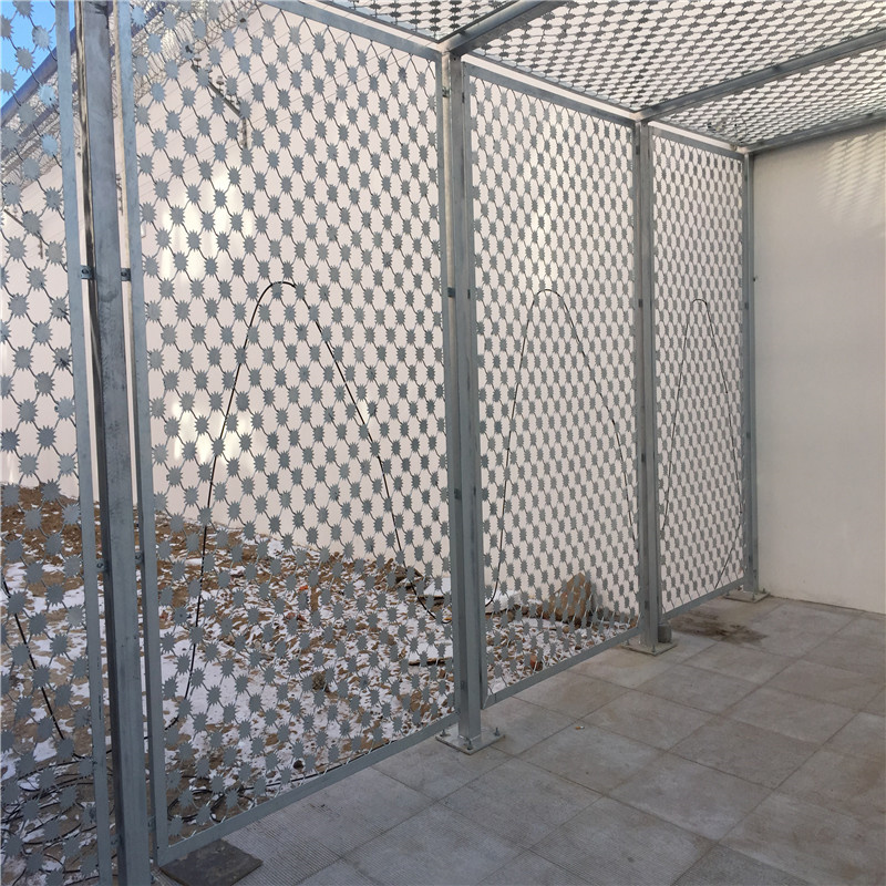 监狱防爬网 款式也可以叫太阳花刺片网,立柱选用Y型镀锌钢管制造而成,钢管的壁...孔径为50mm*100mm或许50mm* 200mm。 9、防爬网的网片中带有V型加强筋,可大大添加防护网的抗冲压能力。 [ 查看详情 ]