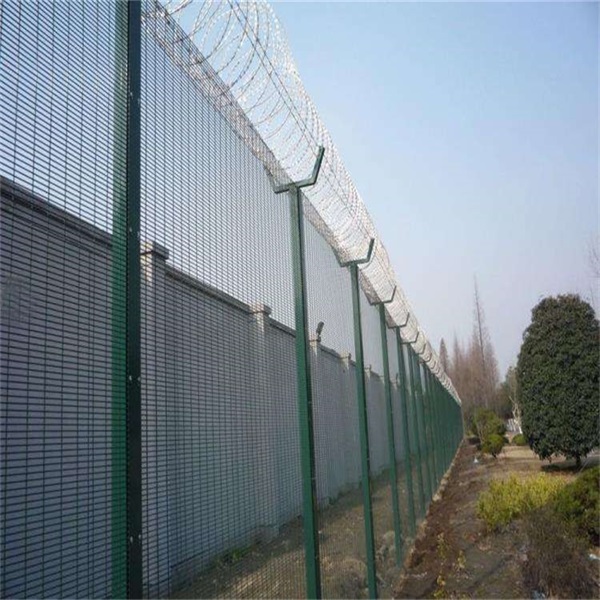 358加密防攀爬隔离网 (钢网墙)是一种监狱外围界用的外型高大、密网孔焊网,上部有保护性尖刺网,网线为镀锌钢丝,加PVC涂塑处理,在...358护栏高密度的网孔,让手脚都无法抓附,起到了了很好的防攀爬的防护作用。3.防剪——丝径超大,网孔密集,令钢丝剪毫无用武之地。 [ 查看详情 ]
