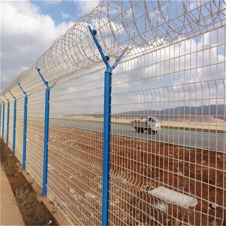 机场围界网是一种高安全隔离防护网,这种新型隔离网一般由钢筋焊接网、Y型防护立柱以及蛇腹式刀刺网等几大主体组成。既有良好的通透性,又能起到强有力的安全隔离防护效果。顶部加装刀刺网,锋利的刀型,有效制止的攀爬行为,强有力的发挥着保护机场作用。
